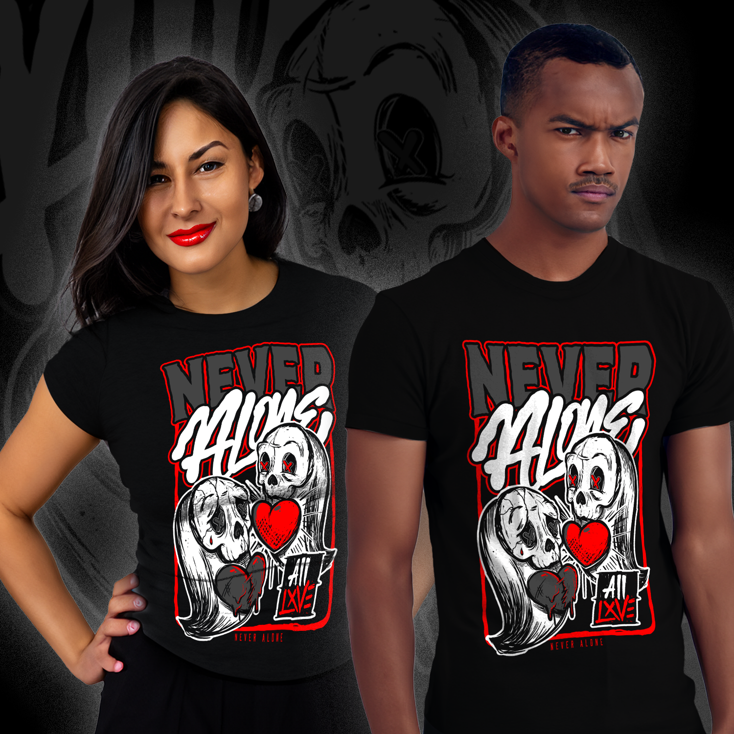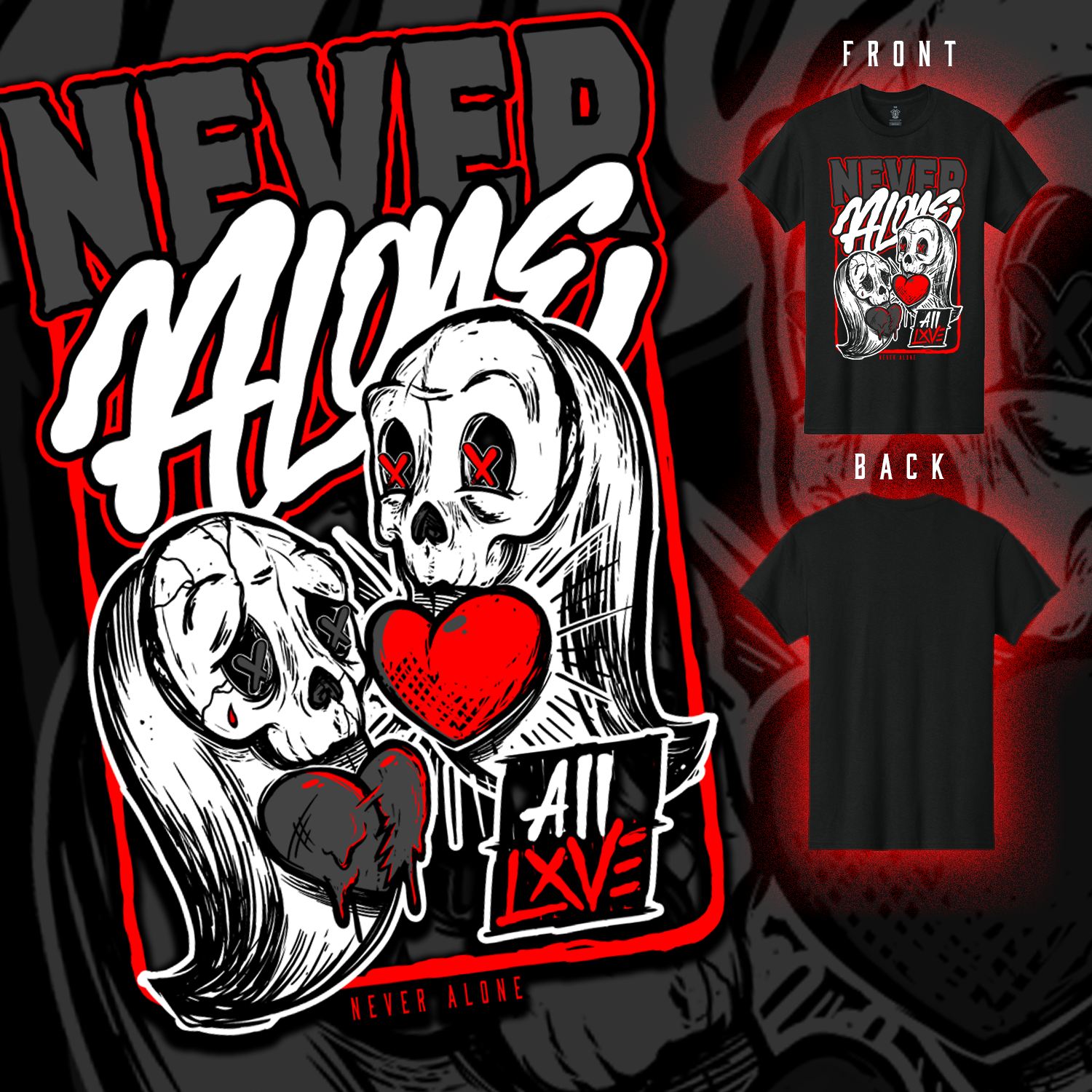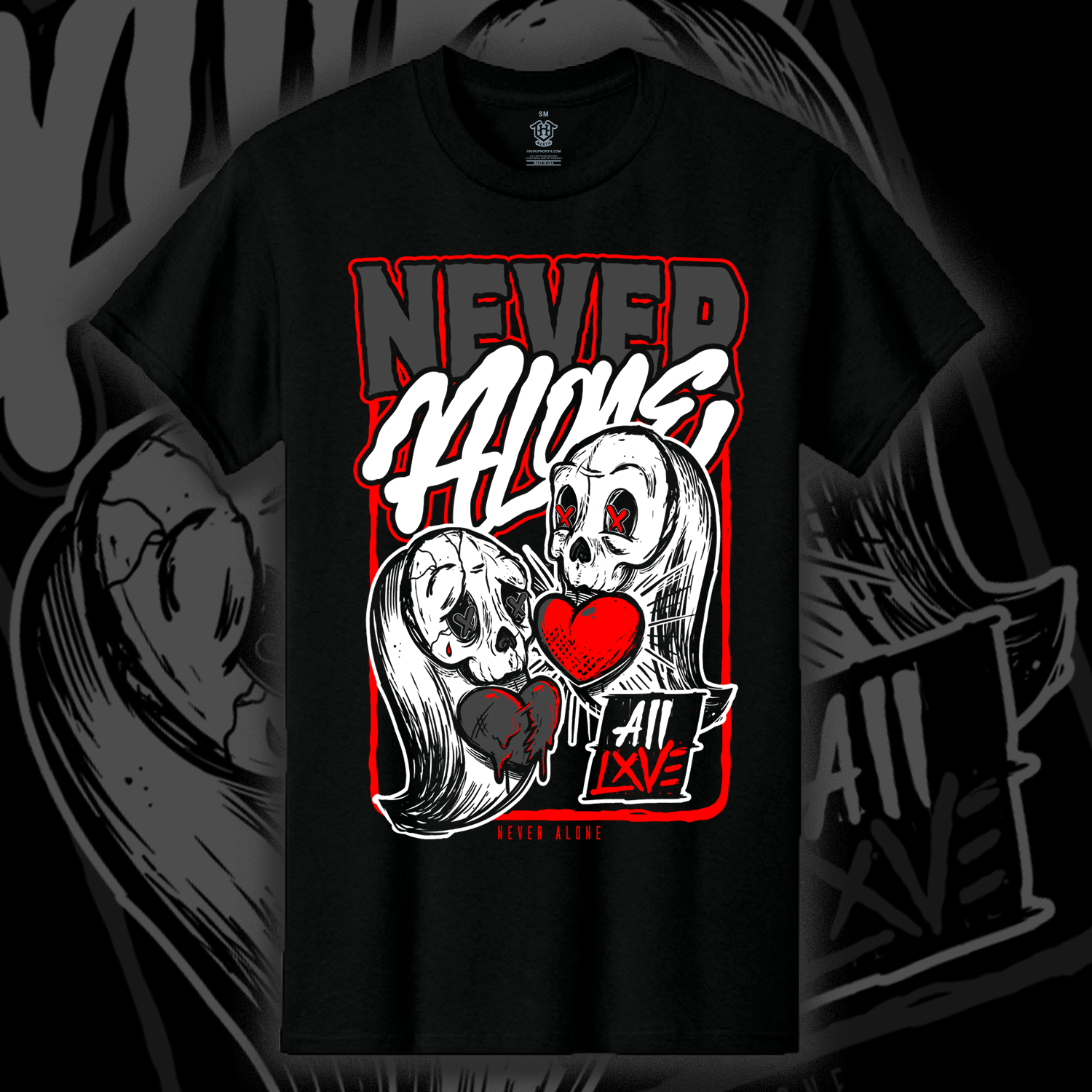 Never Alone is a streetwear-inspired graphic design about survival, connection, and emotional resilience. Featuring two ghost figures with exposed hearts, this artwork represents being supported through pain and hardship. A dark, symbolic illustration made for those who value mental health awareness, street art style, and meaningful apparel.